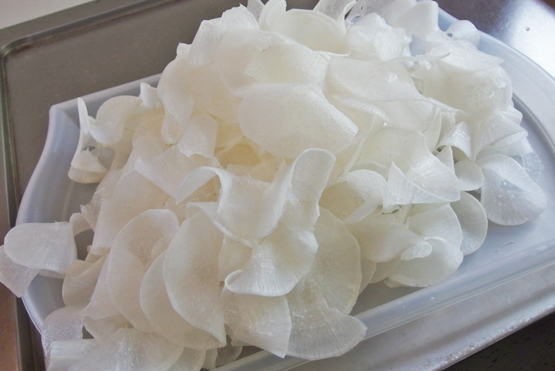何だかお料理に使う気になれません。でも、無農薬有機栽培の貴重な大根、切り干し大根にして使ってみようと思いました。切り干し大根の皮はむかないのですが、今回は止む無くむいたら、中は以外に綺麗でした。