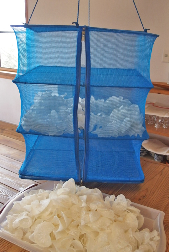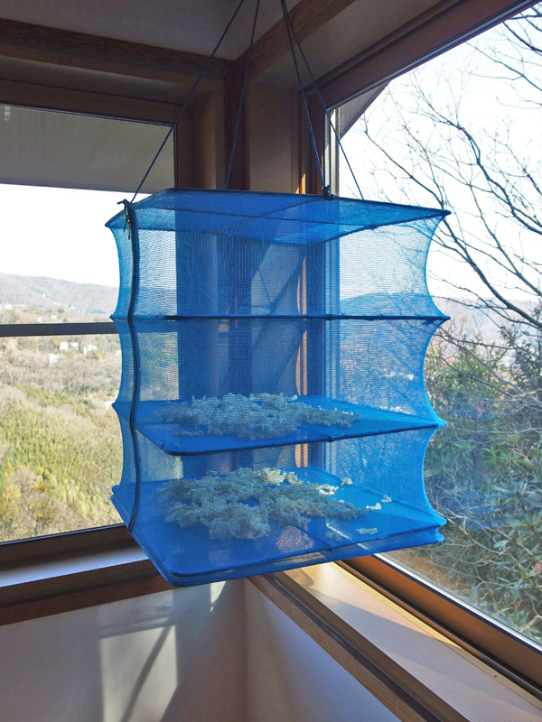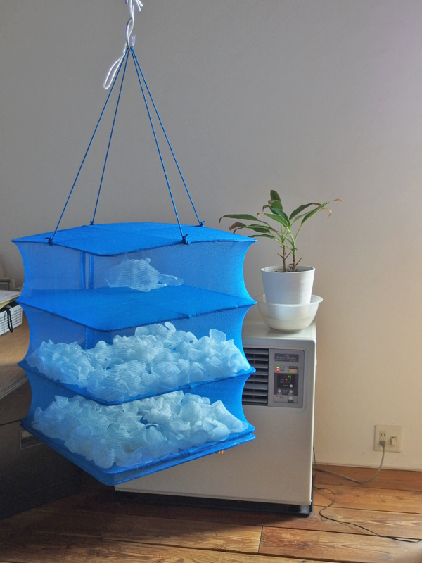 我が家は北斜面で太陽が差し込まないので、先ずアトリエの大型の石油ファンヒーターの熱風で半日干します。