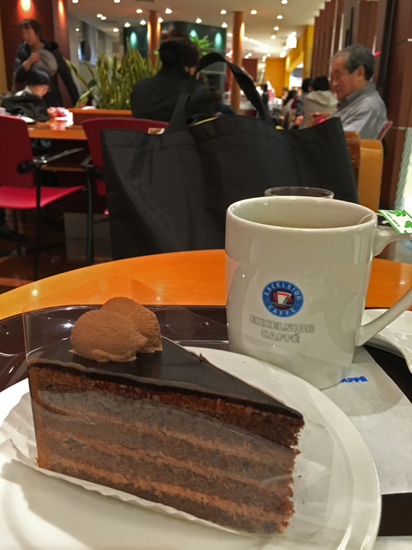 とても疲れていた日、出先の Excelsior Cafe でホッと一息。甘いもの、チョコレートが食べたくなってこんなケーキを食べてしまいました。この頃から疲れが抜けず体調がダウンし始めました。こうして並べてみても分るように、カフェタイムで口にするのは、澱粉、油脂、砂糖ばかり。これでは血糖値のバランスも崩れやすく体の負担になります。