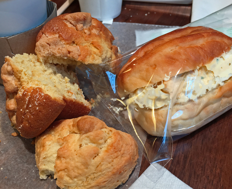 品川駅中 ecute にある BreadWorks イートインの席は5~6席です。運よく席があったのでMさんとちょっと寄って朝ごはん。スコーン、マフィン、Mさんは卵のサンドイッチです。パンもコーヒーも素敵に美味しくて感動でした。