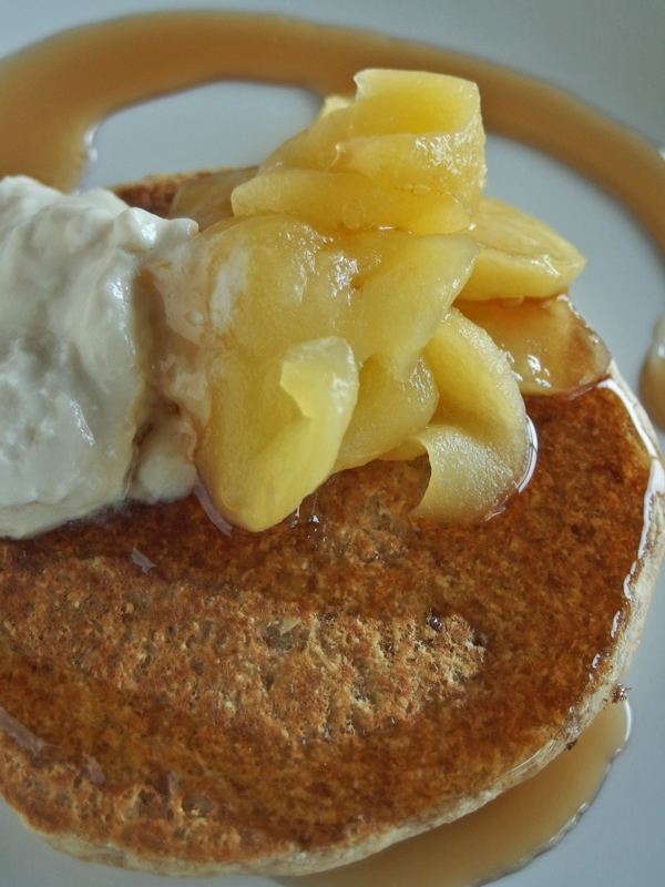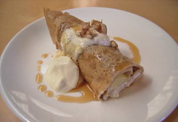 蕎麦粉と卵の代わりにひよこ豆の粉で作ったガレットの中にはお砂糖なしで煮た林檎が入っています。豆乳ナッツクリームとクルミを添えてメープルシロップをかけます。