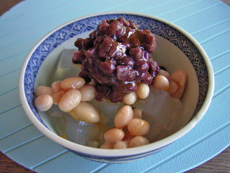 甘みなしで煮た小豆餡と豆と寒天、米飴に水を少し足して作ったみつをかけて頂きます。