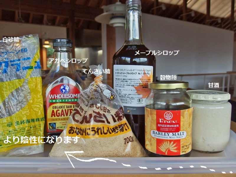 ご飯は噛むと甘くなりますが、これは唾液中の酵素が澱粉を分解して糖になるからです。甘酒はお米と麹で作りますから中庸のお米に近い甘みです。穀物飴はその甘酒をもっと糖にしたもの、糖への純化が進むほどより陰性になります。純化した糖を食べると糖がダイレクトに吸収されるので血糖値が急に上がる。澱粉に近い糖、精製度の低い糖を食べれば、分解して消化吸収まで時間がかかるので血糖値が急に上昇しないので体に優しいのだそうです。