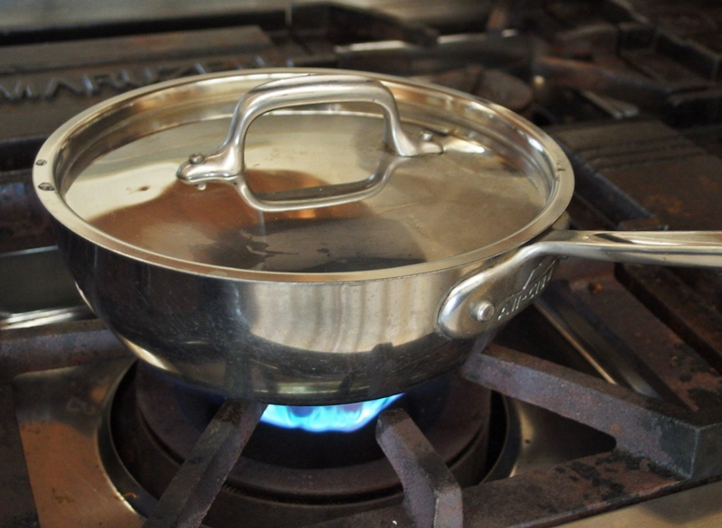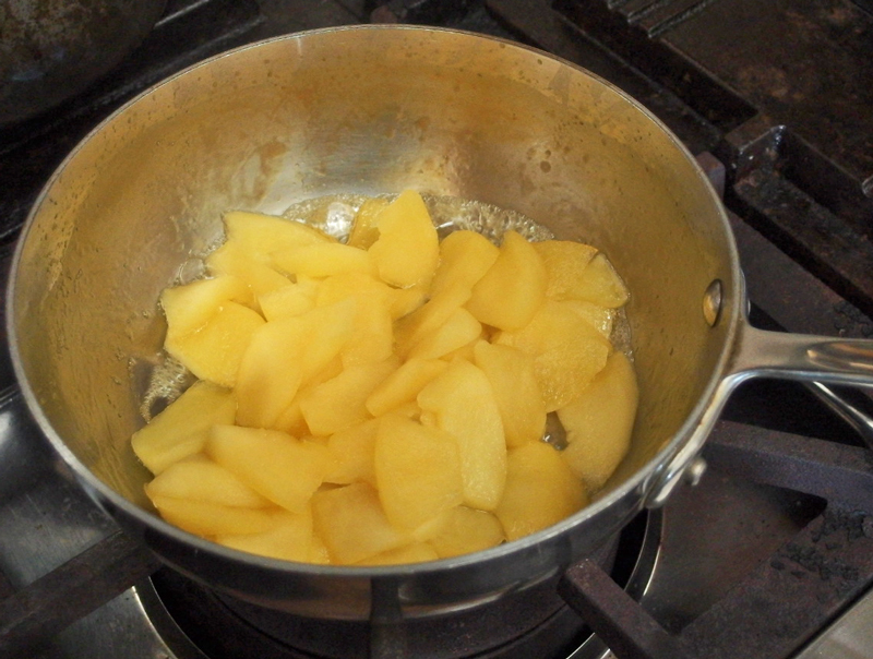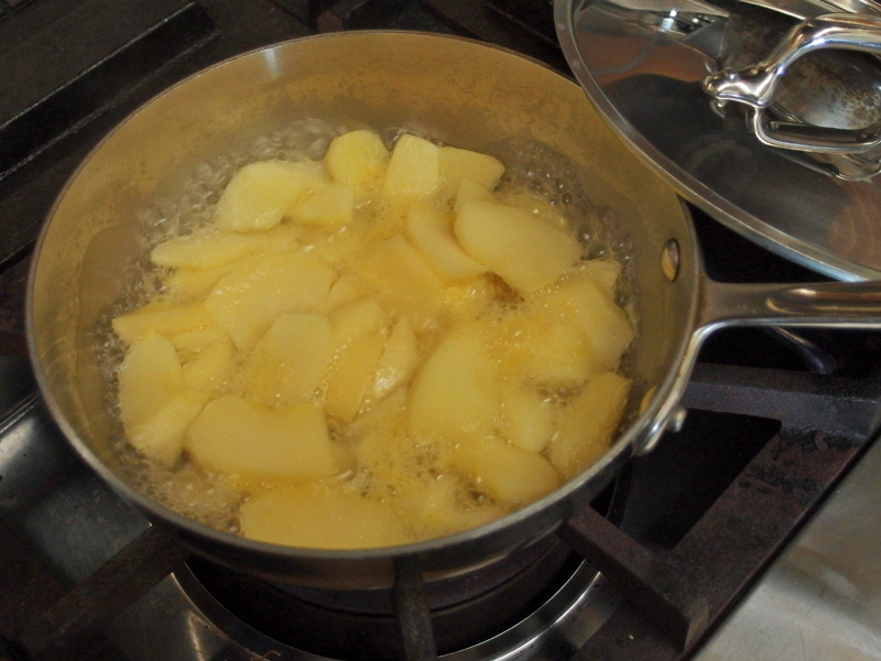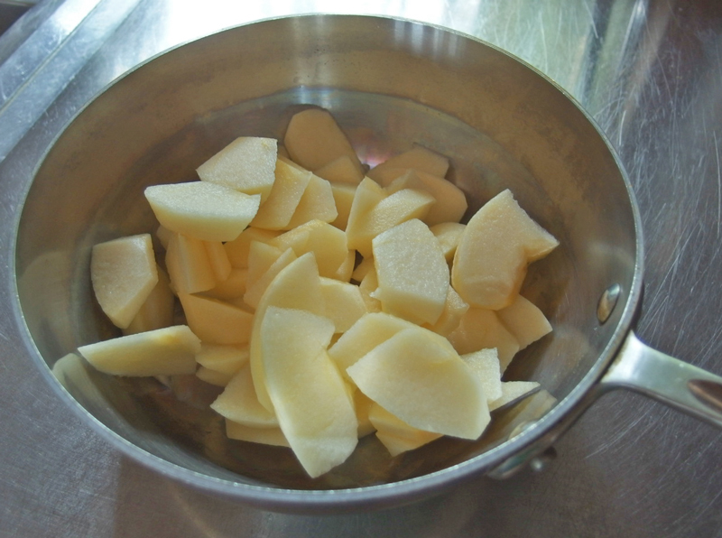 ② ①にヒタヒタより少ない水かリンゴジュースを入れ蓋をして強火にかける。