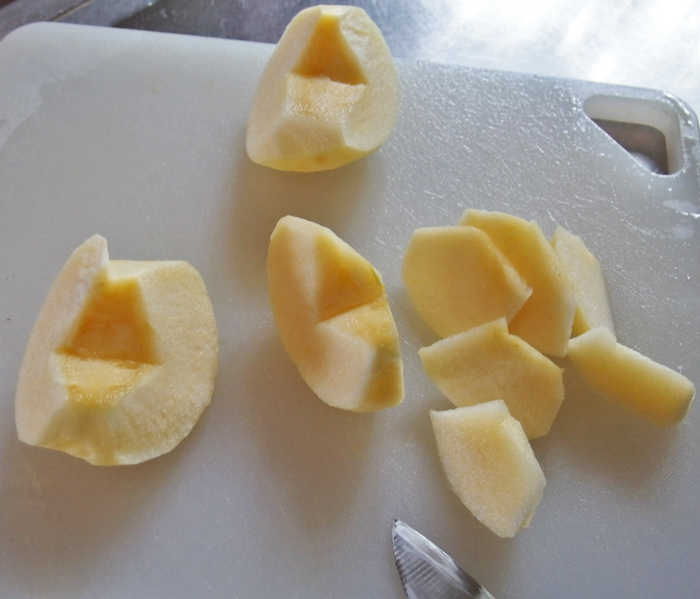 リンゴは皮をむいて一口大に切ります。