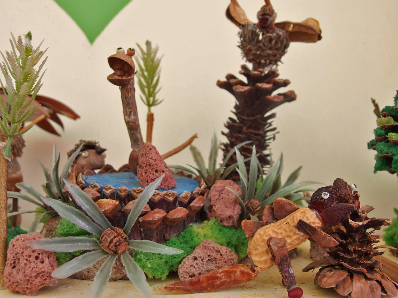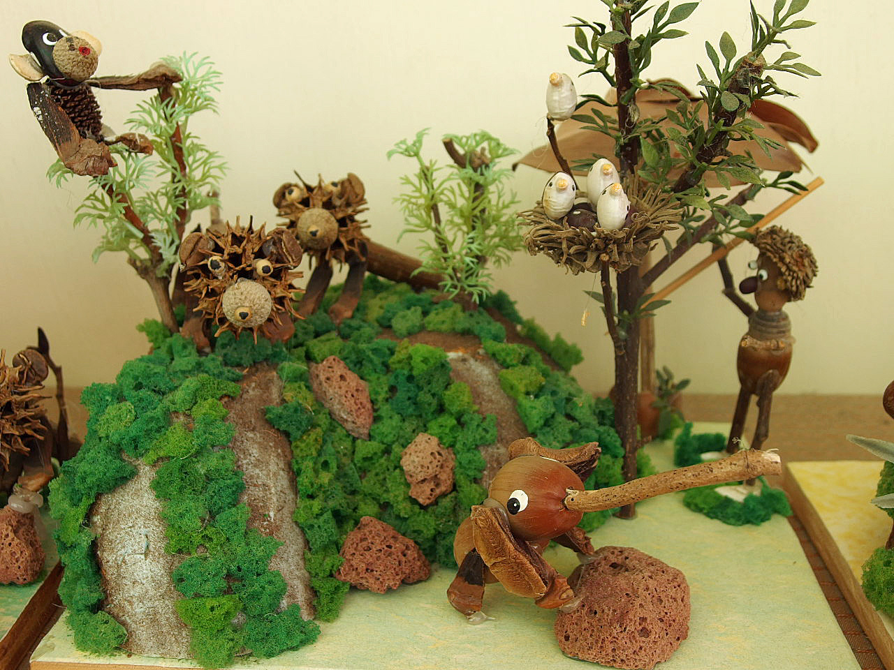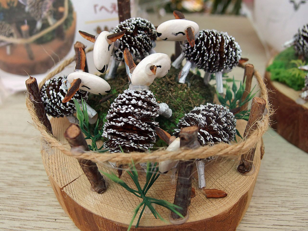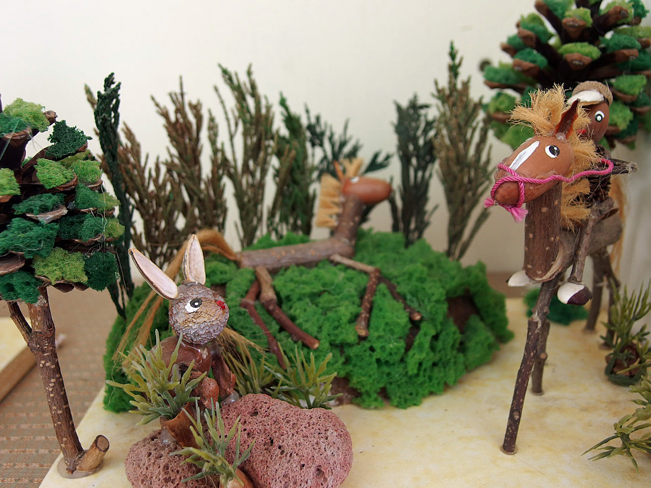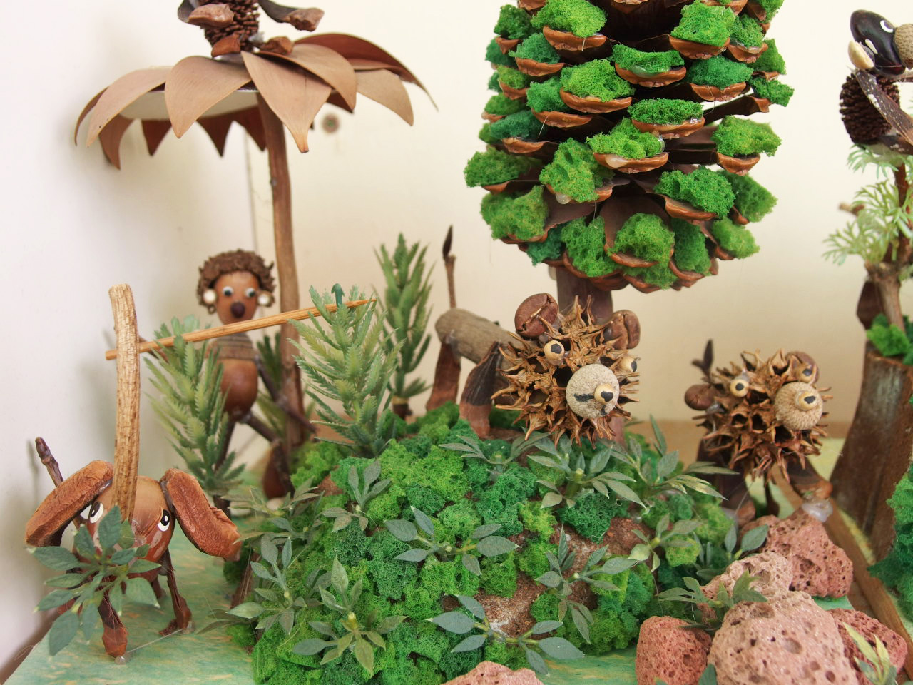 私はネイチャー・ジオラマというものを知りませんでした。 店内にその看板を見て何かしら? と、近づくと木の実などの自然素材で作った動植物の盆栽のようなものが並んでいました。 生き生きしていて可愛くて、見ていて飽きません。素材をとてもうまく生かしていて、見ているうちに自分でも作りたくなって来ます。