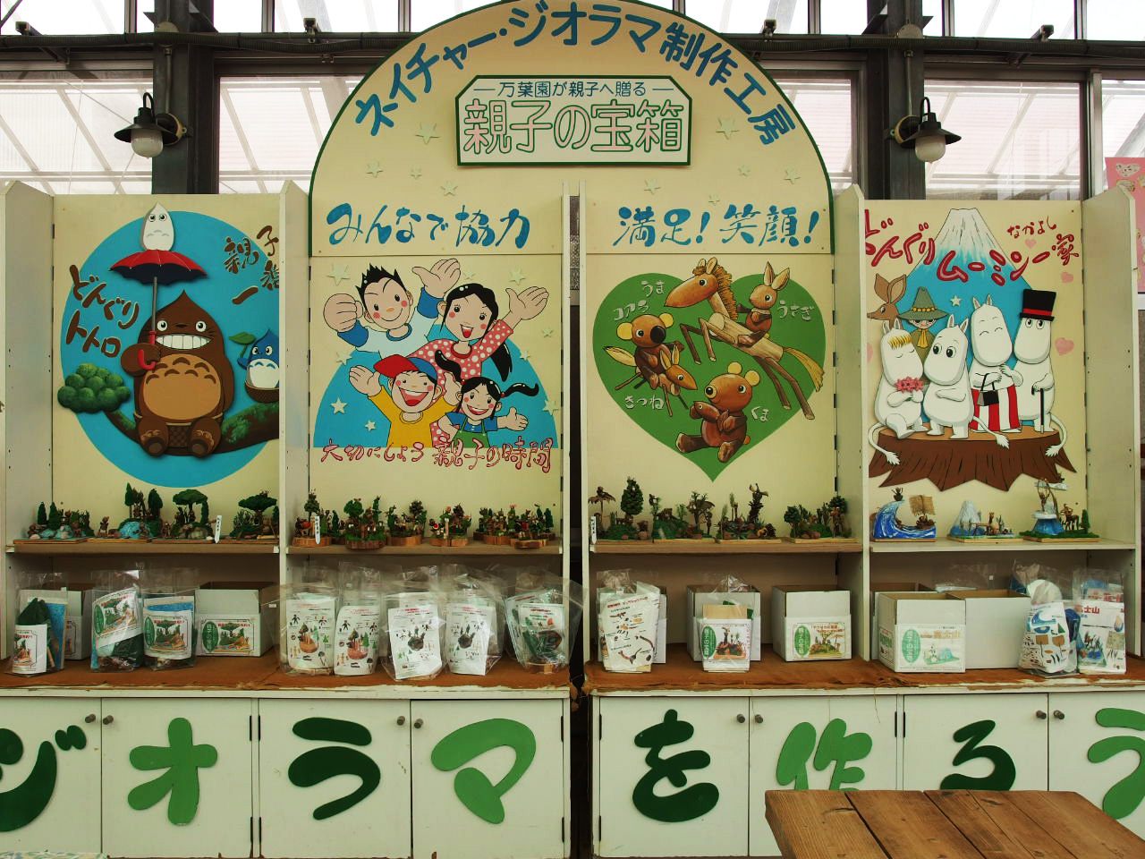 それぞれのジオラマのキットも売られていて、キット以外にも色々な木の実や殻もそろっていて、自分で自由に創作も出来るのです。 平日なので店内はガラガラでしたが、テーブルに“制作優先”と書いてあるところを見ると、休日は子供達で一杯になるのでしょう。