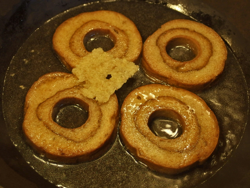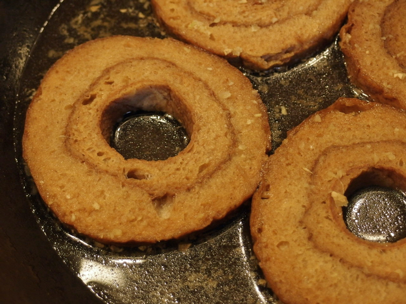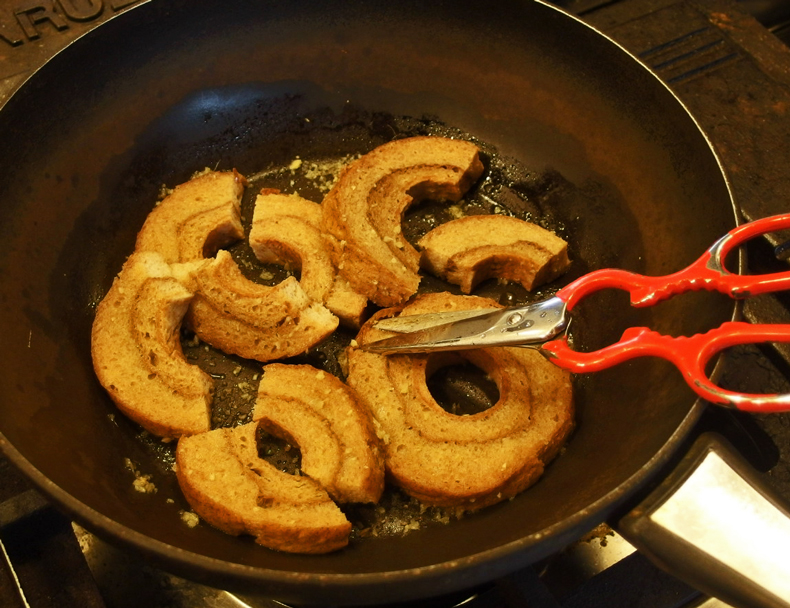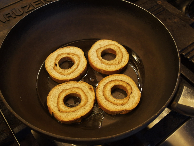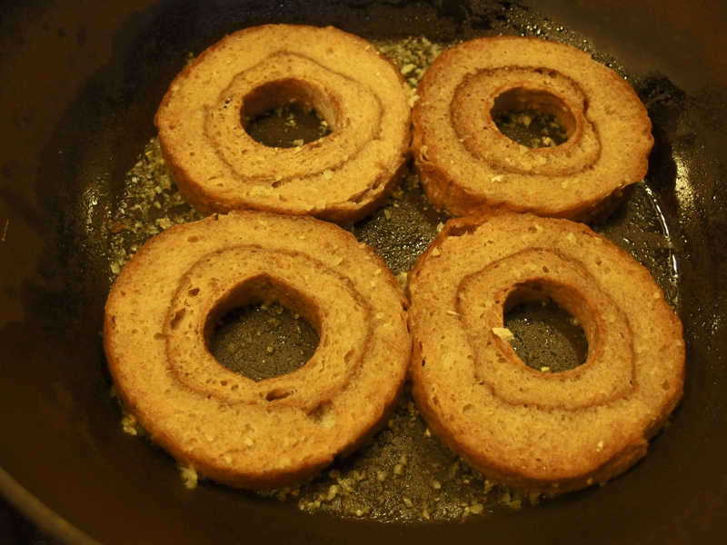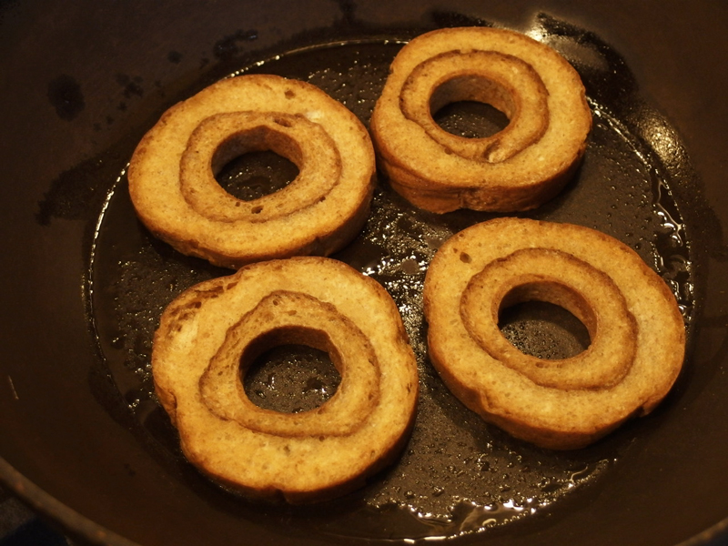 鍋に油を入れ、車麩を並べ中火にかけます。ほんのりきつね色に焼けたら裏返し・・・