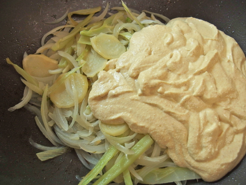 先に作っておいた中身の鍋に、卵代わりのタネを入れます。