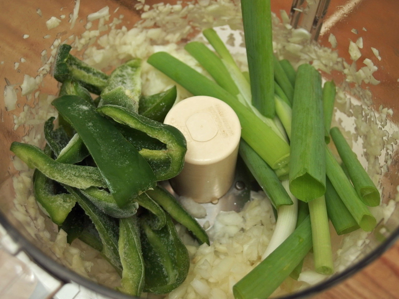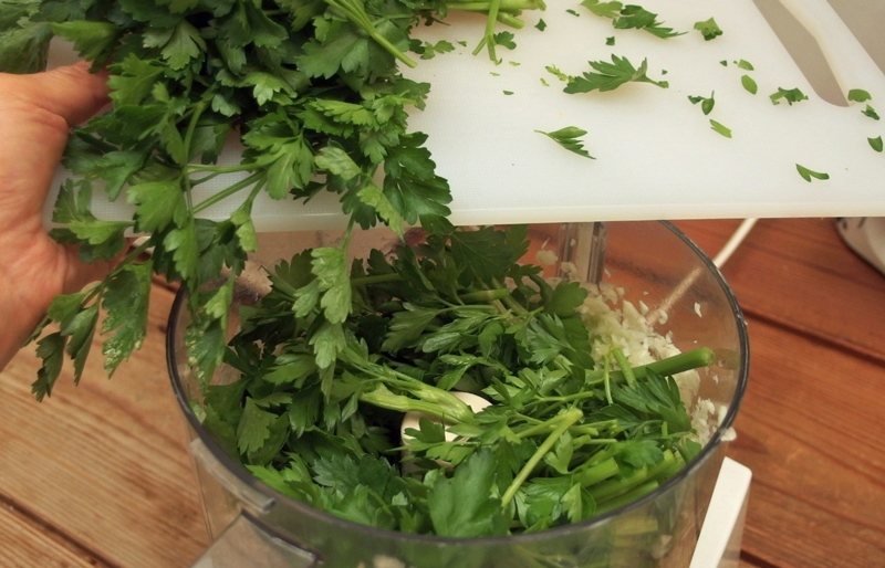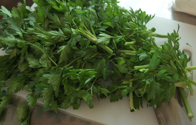 この写真は昨年の4月30日に撮りました。イタリアンパセリはトウがたっていますが、フードプロセッサーにかけるのでこのまま全部使ってしまいます。ピーマンの代わりに前年の秋に収穫した赤くなる前の緑のパプリカを使っています。
