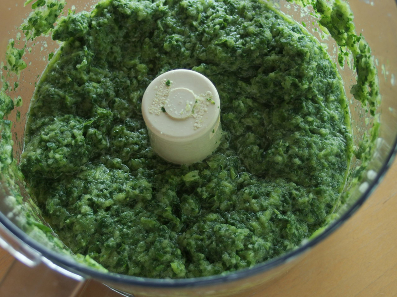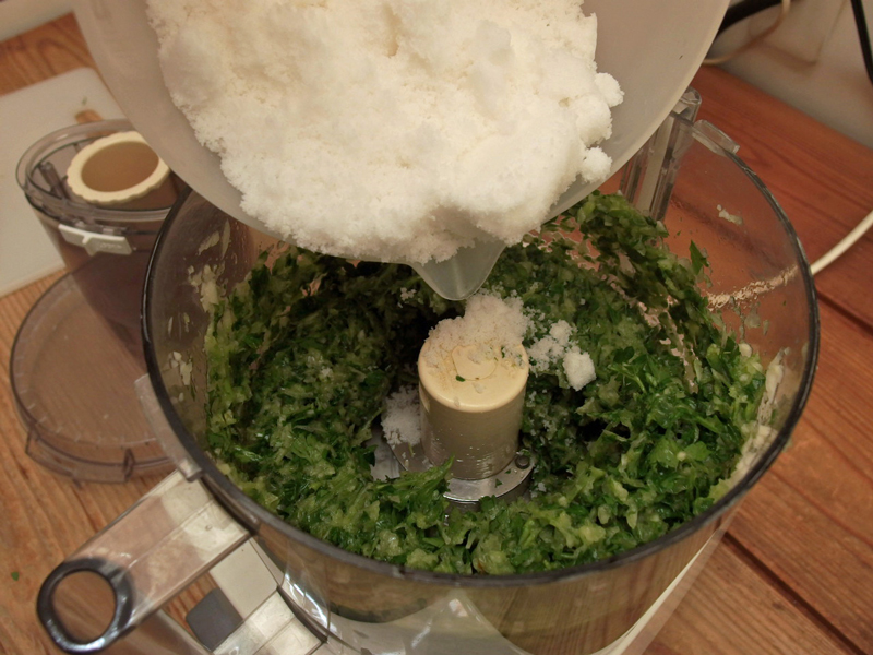 ・野菜類を全部フードプロセッサーにかけ、次に塩を加え更にプロセスする。