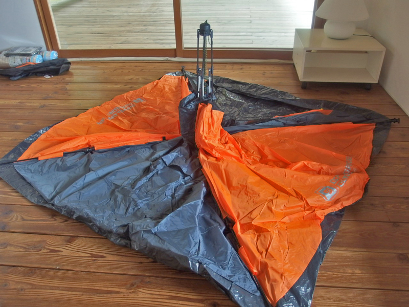 こんな風になり、真中につている傘の骨のような物を立て紐を引くと、テントが開いてきて・・・