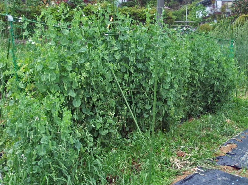 下の畑のスナップエンドウです。こんなに上手に出来たのは実は初めてなのです。エンドウは11月に播いて小さな苗で冬を越して春になって実をつけるのですが、真冬の寒風にあおられて青息吐息になってしまい今までは上手に作れないでいました。昨年Mさんが体調を崩した事もあって、出来るだけ楽で失敗の少ないスナップエンドウの冬越しをネットで調べていたら、「スナップエンドウの不織布トンネル・わたしは、モノグサトンネルで行く」という月刊現代農業の記事が目に留まりました。そこにあった通りにしたらこのように大豊作になったのです。