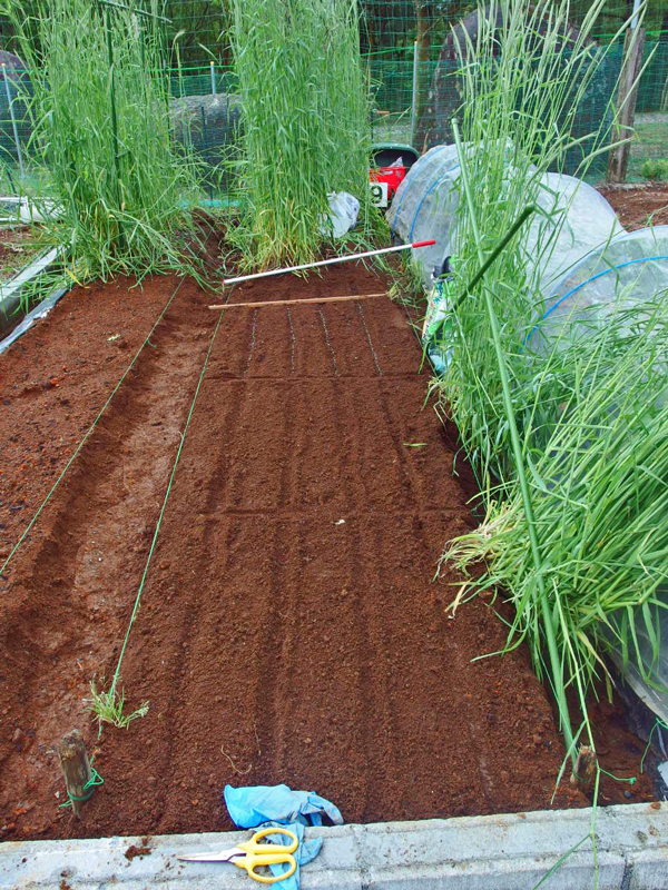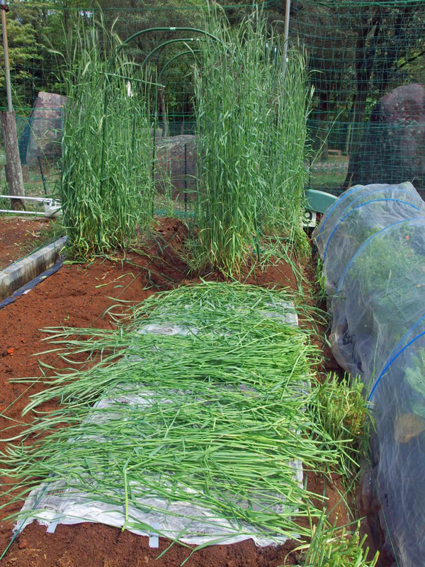 上の畑の人参を育てる場所です。人参は暑さを嫌うのでもう少し早く播きたかったのですが、土づくりが間に合わなくて遅くなってしまいました。周りに生えている高い草はライ麦です。種を播いたのではなくて穂がついているのを前年敷き藁に使ったら、知らないうちに芽が出てこんなに大きくなったのです。