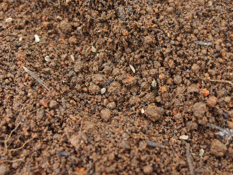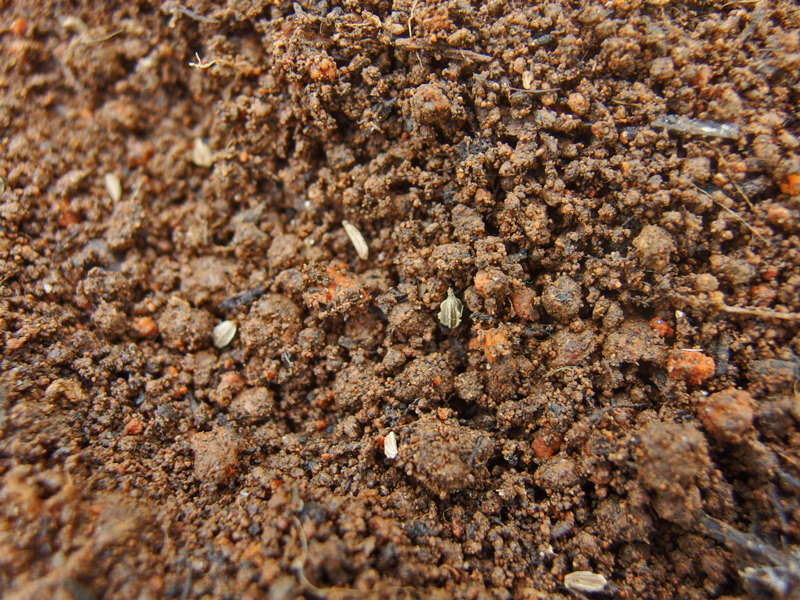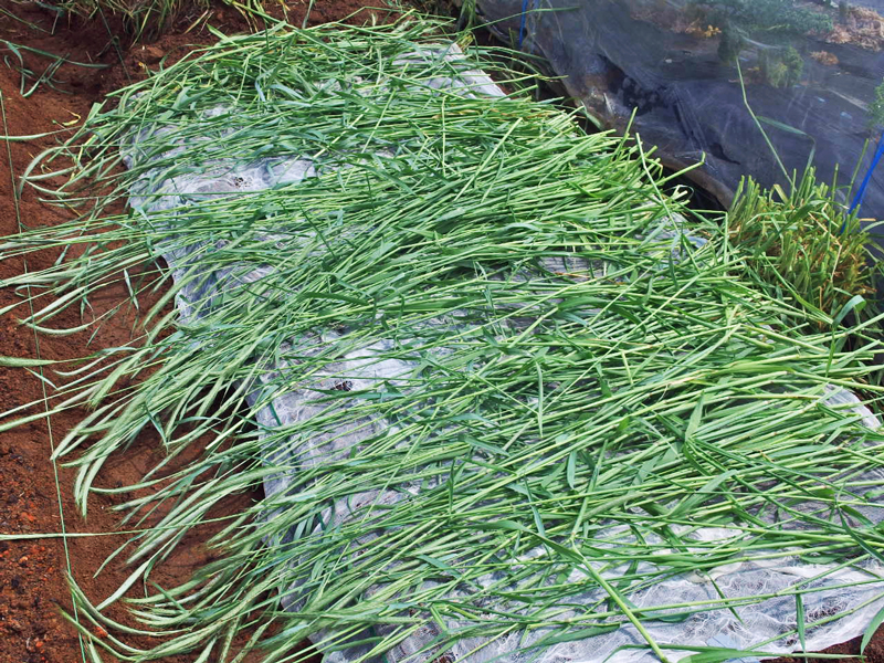 種に土を薄くかけて、その上に乾燥を防ぐための紗をかけてから充分に散水しました。そして心配だったので脇に生えていたライ麦を切って上に敷いてみました。
