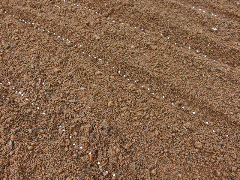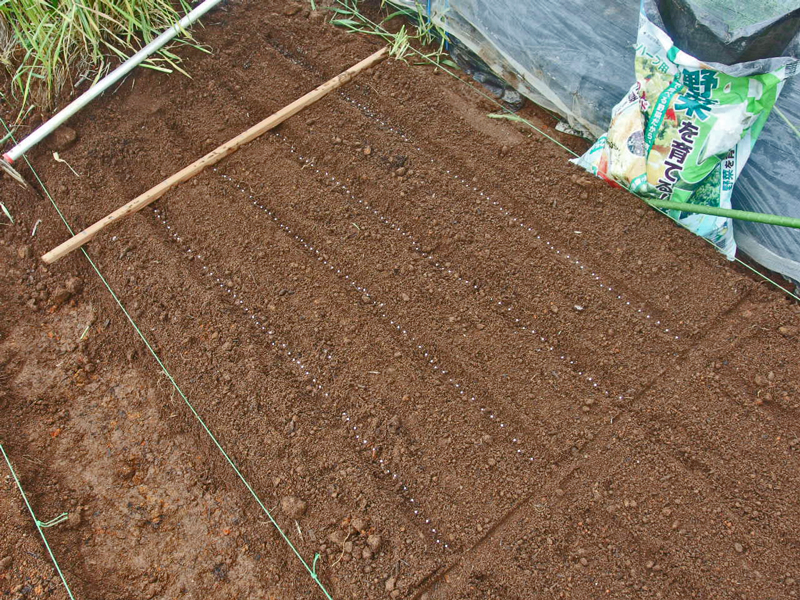 20cm間隔の浅い溝を作って、そこに人参の種を播きます。