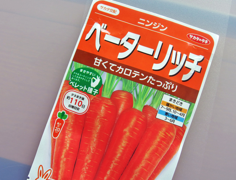 このコーティングしていない種はフランスの人参です。 ”とっても味の良い人参” とあったので試してみたくなりました。人参はセリ科で水を好みます。特に発芽するまでに水を切らさないよう土がいつも湿っていなければなりません。Mさんは散水設備のない下の畑での人参づくりを何度か失敗したので、水道が引いてある上の畑で今度は私が作ってみる事になりました。うまく行くでしょうか・・・