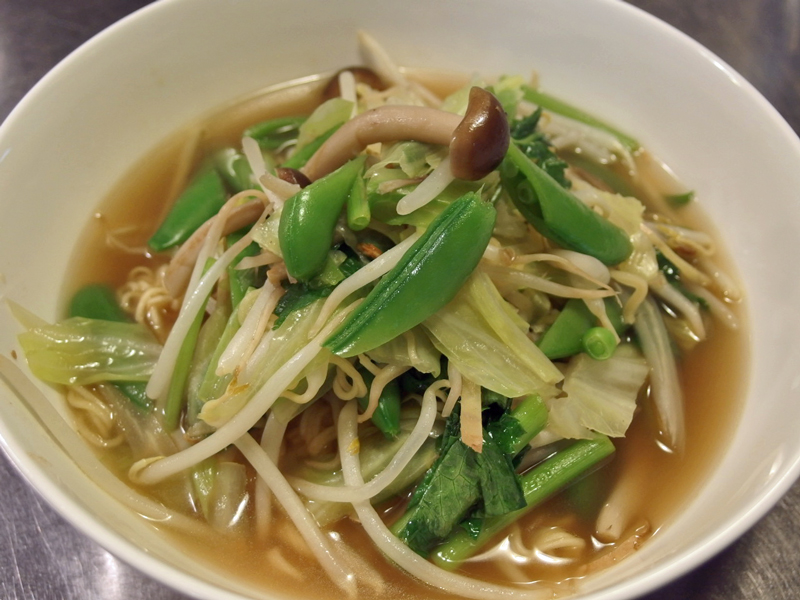 麺の上に野菜をのせ、最後にスープを入れて出来上がりです。