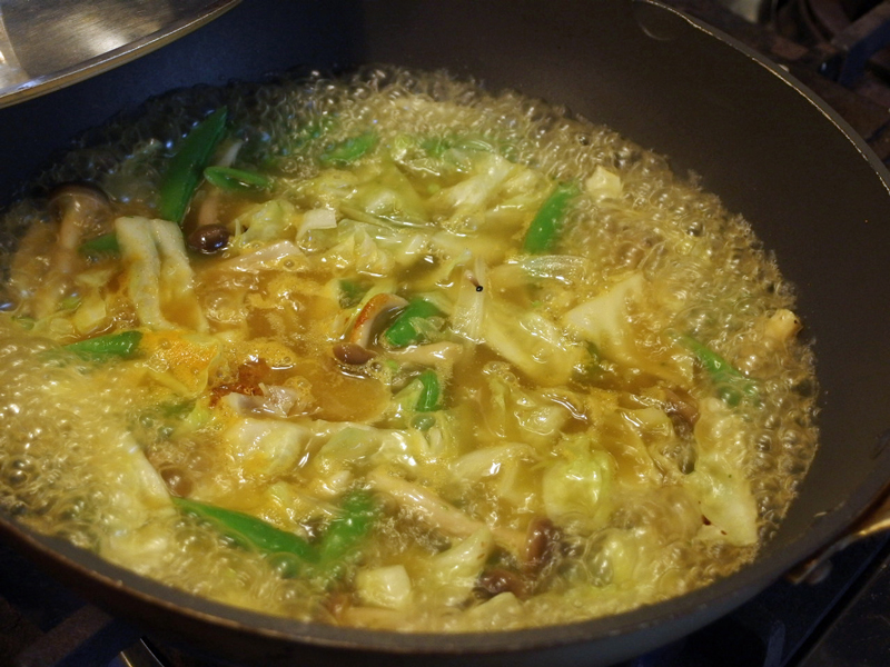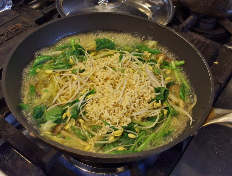 冷蔵庫にある野菜をたくさん入れて、これだけでも一食になるようにしました。実は今日も疲れて夕食の準備をする元気がでなかったので、また菜食インスタントラーメンでした。準備をしかけてからブログに書こうと思いつき、作り方の写真を撮りました。