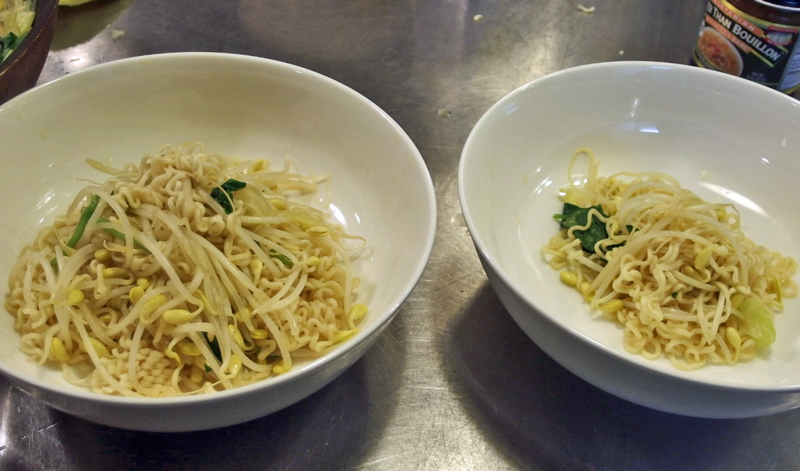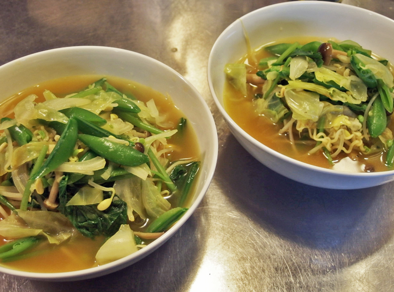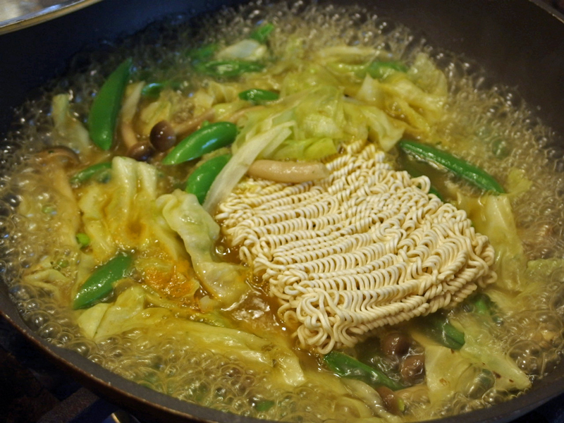 どちらのインスタントラーメンも丼に入れてお湯を注いで3分で食べられると書いてありますが、私は野菜を炒めた鍋にスープを煮立て麺を入れて作ります。