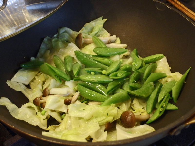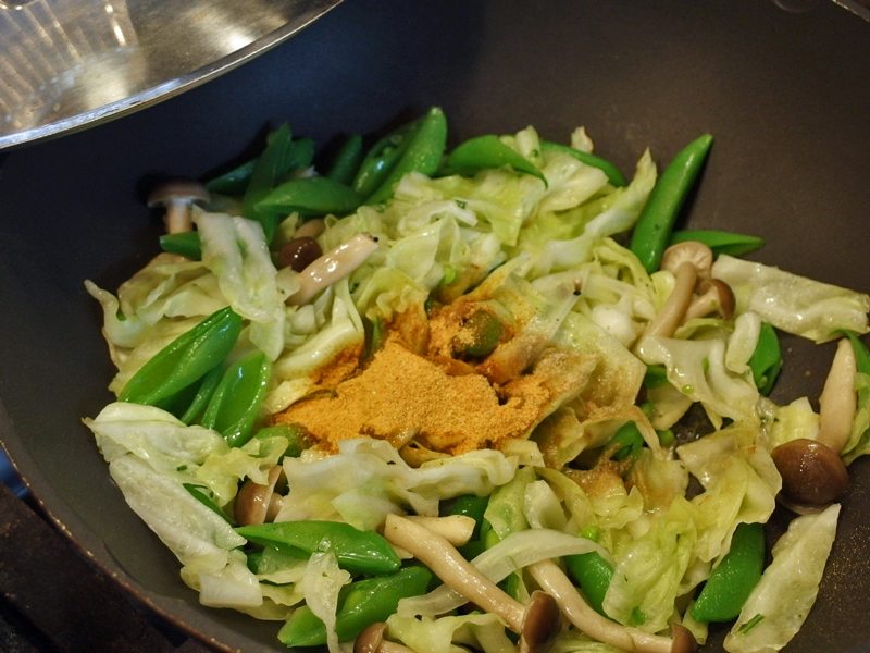先ず中華鍋にオイル少しとシメジを入れ火にかけ塩をふって軽く炒めます。次に煮えにく野菜から順に入れて炒めて行きます。ここでは次にキャベツを入れ・・・