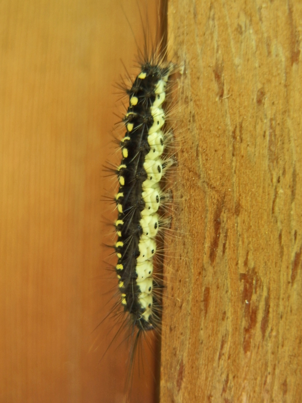 勝手口の外壁に未だいたのを見つけました。この虫が先日大発生して必死で退治したのですが、退治しきれなかった虫がまた広がっています。これはキアシドクガの幼虫で、白い蝶のような成虫になります。ドクガと名付けられていますが毒はないとの事。