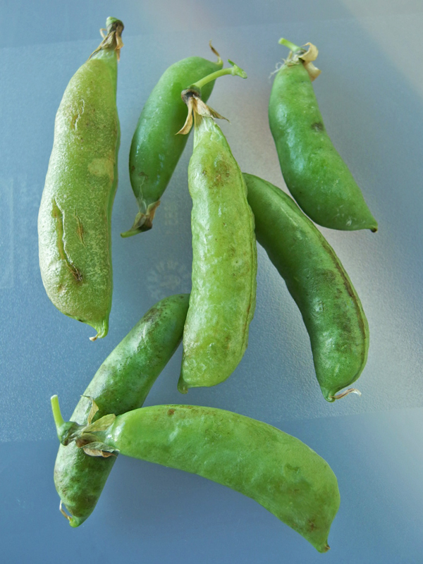 採り忘れたスナップエンドウは、豆が育って膨らみ、サヤは薄く固くなってこんな風に肌も荒れてきます。今までは捨てていたのですが、豆がどうなっているのか割ってみたら、中から元気で美味しそうな豆が出てきました。