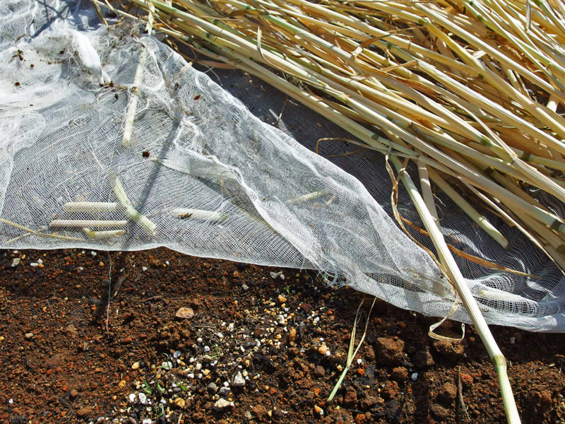 種を播いてから2週間目です。 人参の芽が出そろった様子なので紗と藁の布団を外しました。