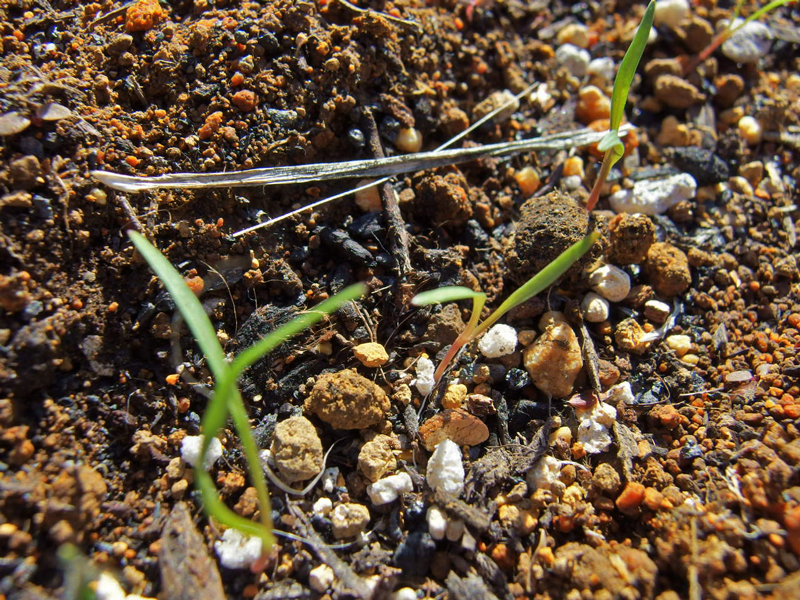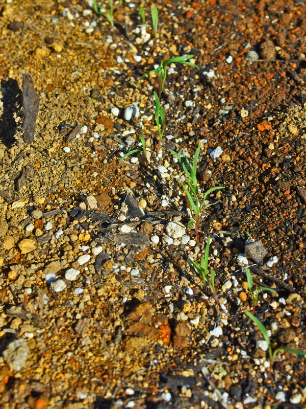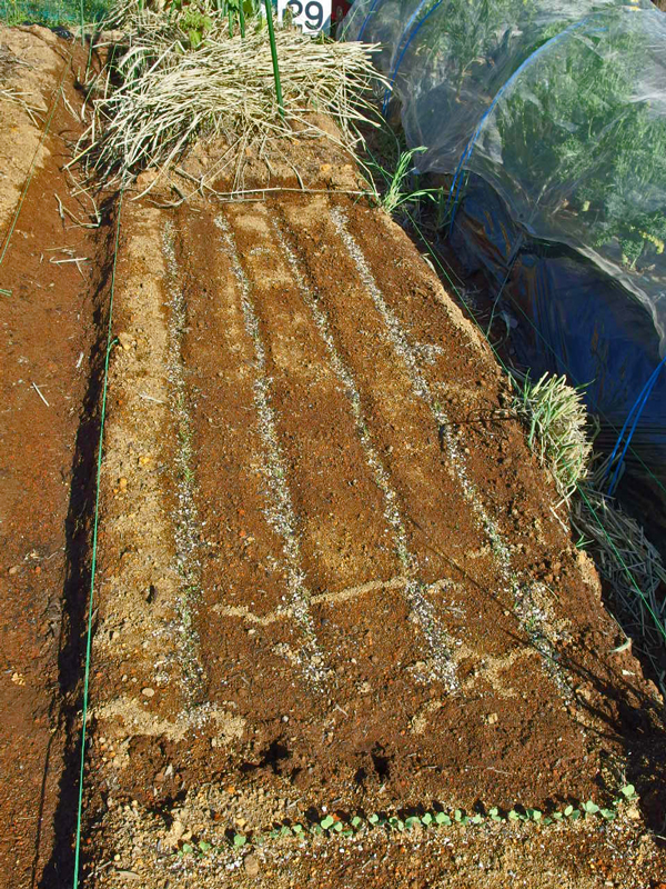 人参の種は紗と藁の下に眠っています。1日おきに見回りに来て土が乾かないように注意していました。手前の人参より後に播いたラディッシュはもう芽が出ています。
