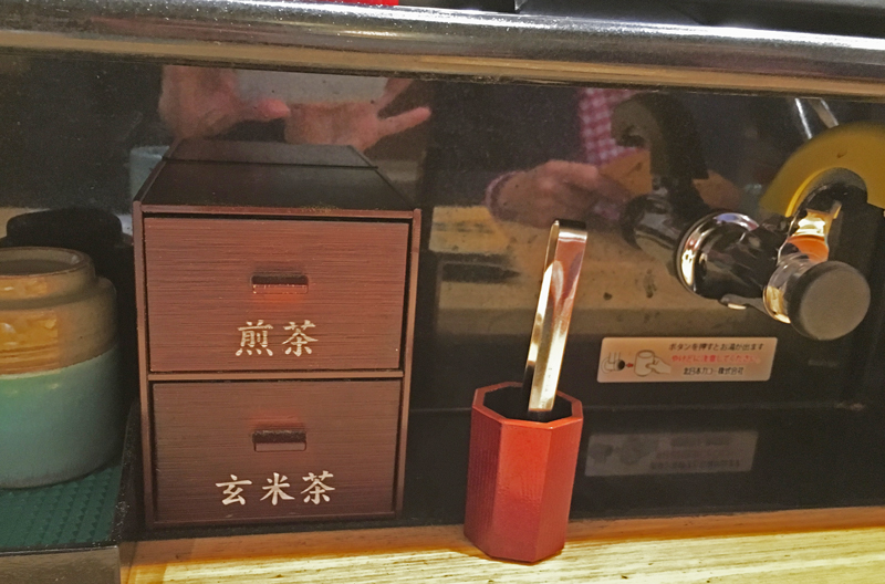 カウンターには自分でお茶を入れるキットが揃っています。焼き物の茶碗!お茶は2種類あってティーバッグ、トングはティーバックを新しいのに入れ替える時使うのだと思います。「はま寿司」はプラスティックのお茶碗で粉茶です。茶碗で押すとお湯が出るカランは同じでした。