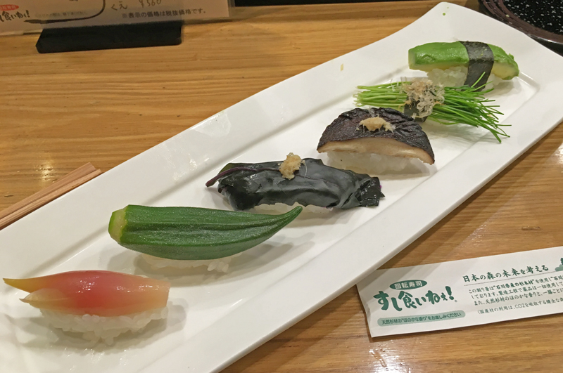 私が先ず注文したのはこれです。「ベジタブル寿司盛り合わせ」6種類の野菜寿司が並んでいます。