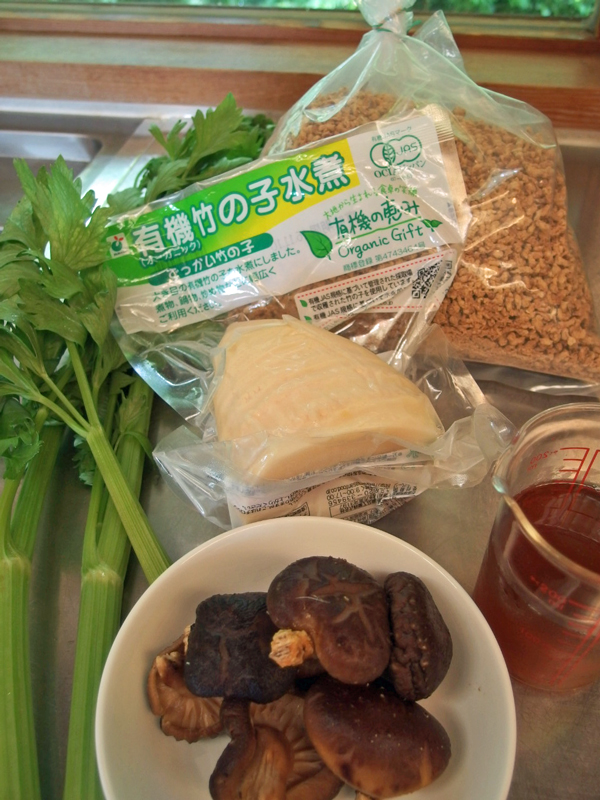 ③ 中華鍋に油と椎茸を入れ、椎茸の香りが立つまでじっくりと炒めてから戻した大豆ミートを入炒め、次に筍とセロリを加え、調味料を入れ、最後に水時片栗粉を入れ火をしっかり通してから火から下す。