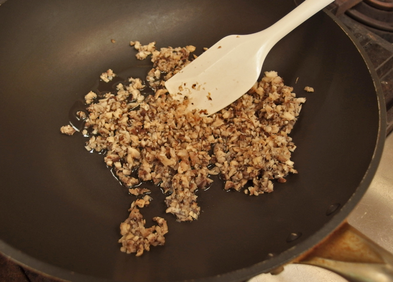 もどした大豆ミートを加え、椎茸の旨味を含ませるように炒めて・・・