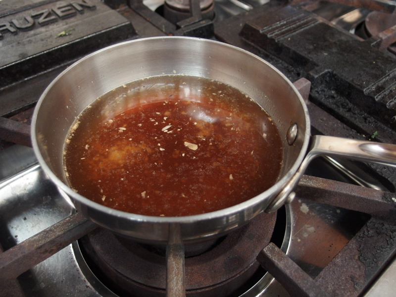 椎茸のもどし汁と水、醤油、テンペロ・アリョ、生姜、焼きだしを小鍋に入れ、