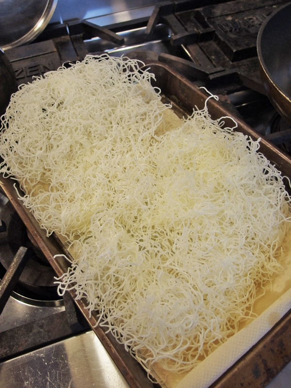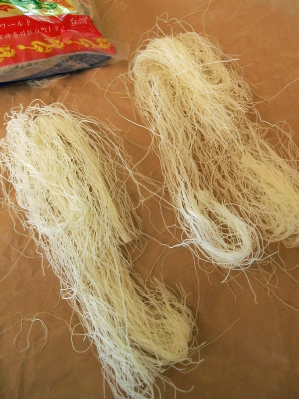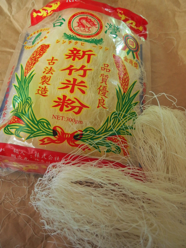 本場台湾の新竹ビーフン、私は麺の細いタイプを使っています。先ず、大きな紙の上にビーフンを取り出し、使う分だけ引っ張って切り離します。