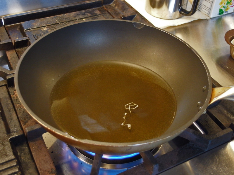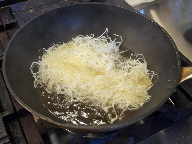 中華鍋に油を熱し、180度=天麩羅の温度にします。ビーフンを1本入れてみてシュ~っと膨らむようになったら、