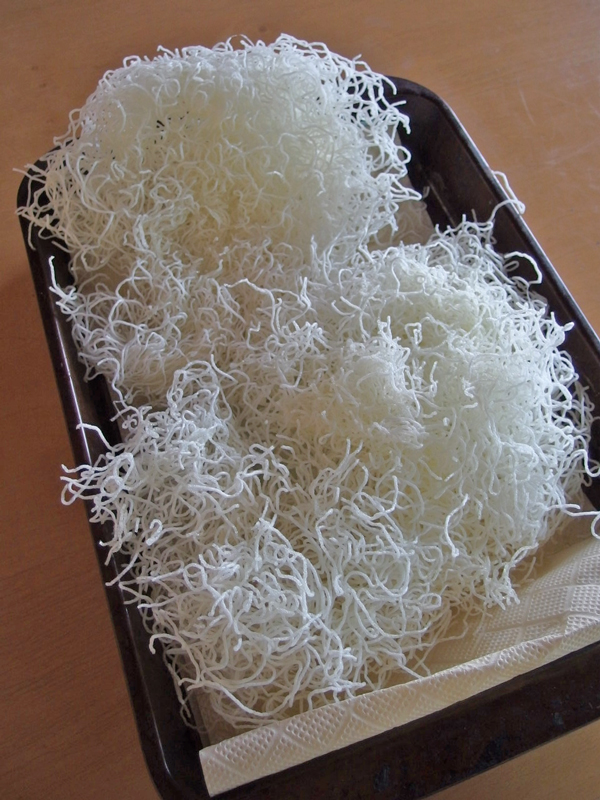 先の写真の量のビーフンがこの位に膨らみました。油に浸かっていない部分があると膨らまないので、揚げ鍋が小さい時や揚げ油が少量の時は、1度に入れるビーフンの量を少なくします。