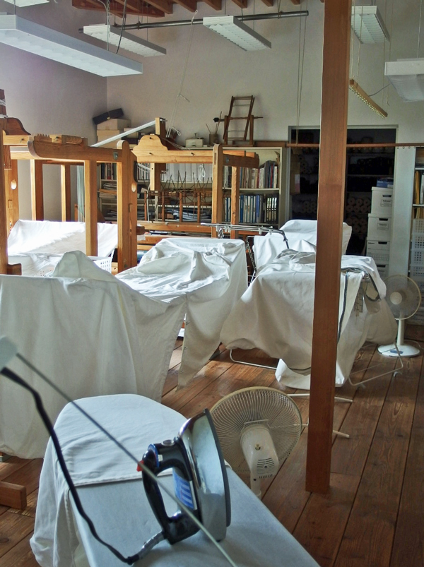 アトリエの大型除湿機と扇風機2台で乾燥させながら、アイロンもかけてている、この白い布は何でしょう?