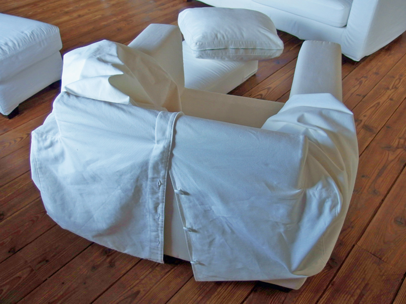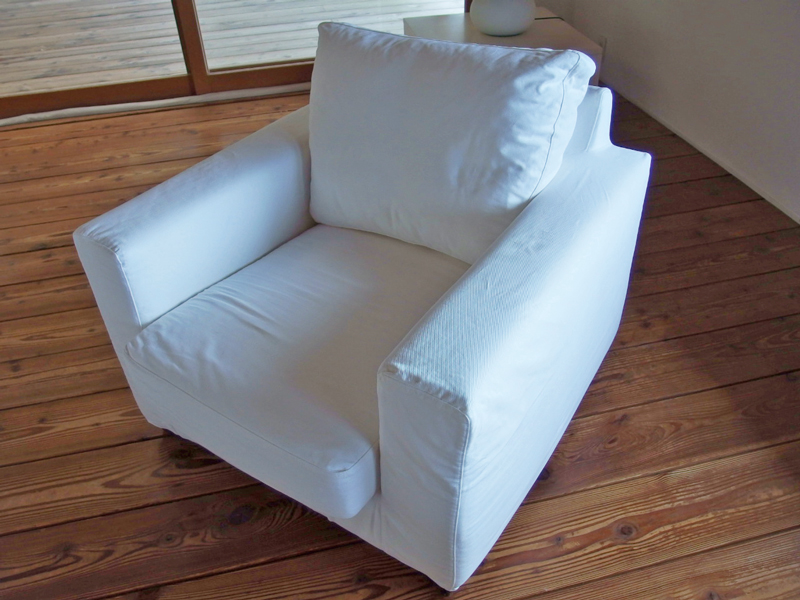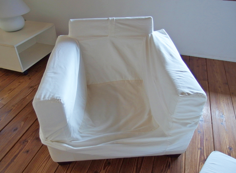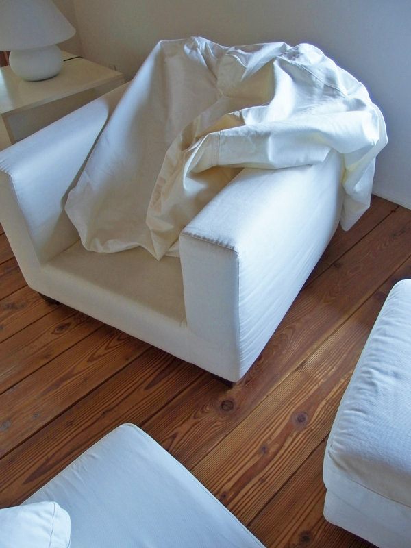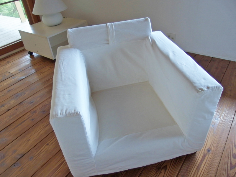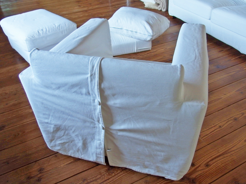 ソファーが白くなって、生地がふっくらと生き返って、部屋が生き生きと清々しくなりました。左手前のクッションのカバーは未だ乾いていないので白い中身のままです。