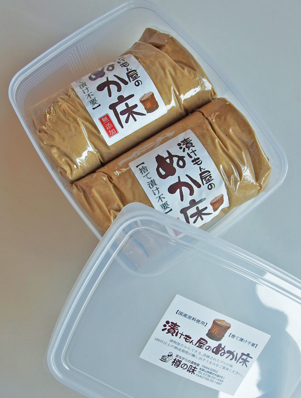 原材料は、和歌山県のキヌヒカリの米ぬか、赤穂の塩、道南の昆布、和歌山の唐辛子と渋柿やみかんの皮、佐賀のきなこ、生姜、全て国産で添加物は一切使用されていないので安心です。普通、新しいぬか床は最初「捨て漬け」と言って、クズ野菜などを漬けて、乳酸菌や酵母などの微生物を増やし床を成熟させるのですが、このぬか床は宮崎や和歌山の大根で既に捨て漬けされ熟成発酵済みなのです。