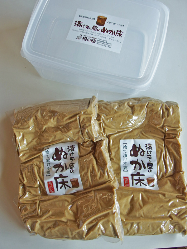 ぬかに塩と天然の香味料を入れ既に熟成発酵させてあるので、買ったその日に野菜を入れるだけでぬか漬けが出来るぬか床です。