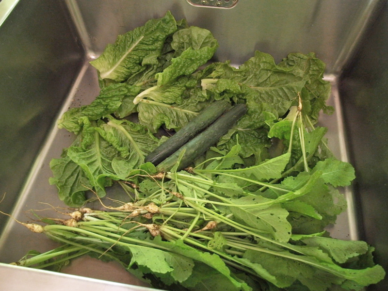 下の畑のMさんの昨日の収穫、チマサンチェ、胡瓜4本、間引いたカブです。今年の胡瓜は良好でコンスタントに収穫できそうとの事、カブも大きくなればぬか漬けにピッタリです。ぬか漬けはMさんの役の方がよさそな気がしてきました。