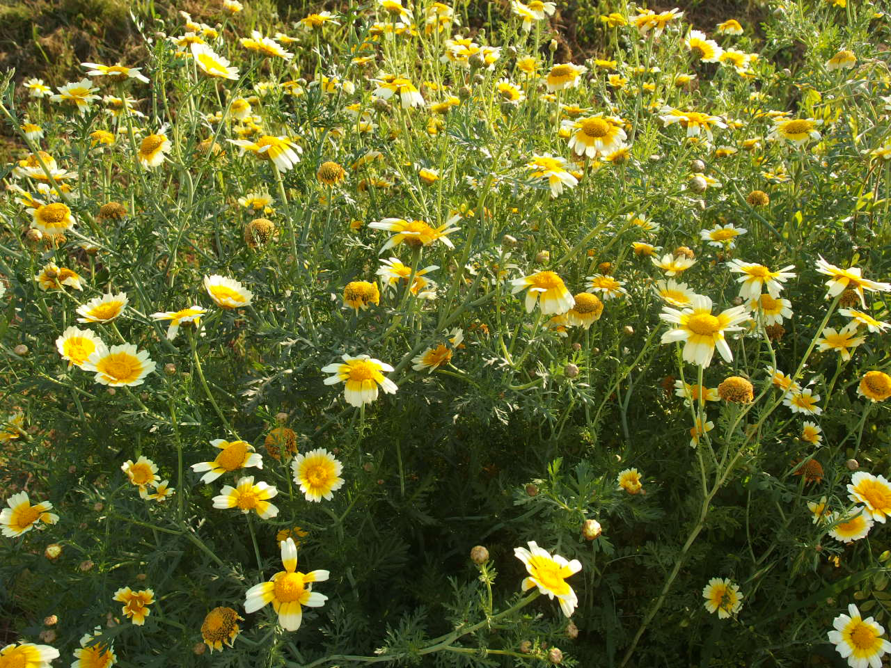 寒さに強いライ麦は、冬の間殆ど肥料なしで育ち、ほかの野菜を寒風から守ってくれます。刈り取った茎は野菜を乾燥や病気から守る敷き藁として使え、残った根は土の中で腐って有機物となり、豊かで健康な土を作ってくれます。 夕日の中でサクサクとライ麦を刈りながら感謝の気持ちがあふれてきました。 作業が終わって腰をのばすと、 春菊の花が夕日を浴びて輝いていました。