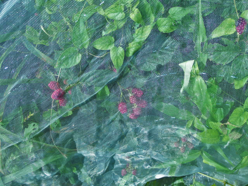 近づくと、鳥よけのネットの向こうに、ブラックベリーの実が赤くなっています。黒くなりかけているのもあります☆