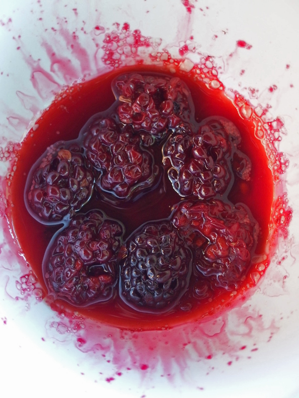 貴重な7粒をボールに入れて甜菜糖を少しふって、電子レンジで20秒ほど加熱してベリーソースにしてみました。素晴らしい色☆