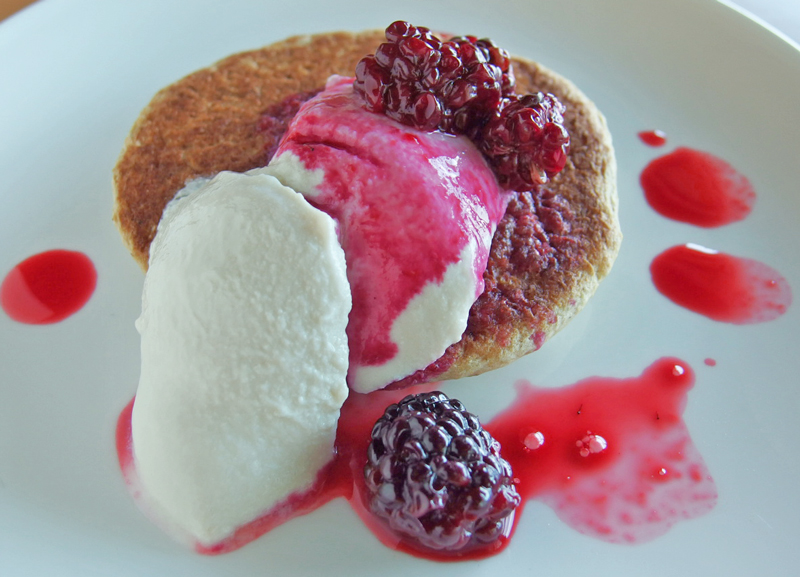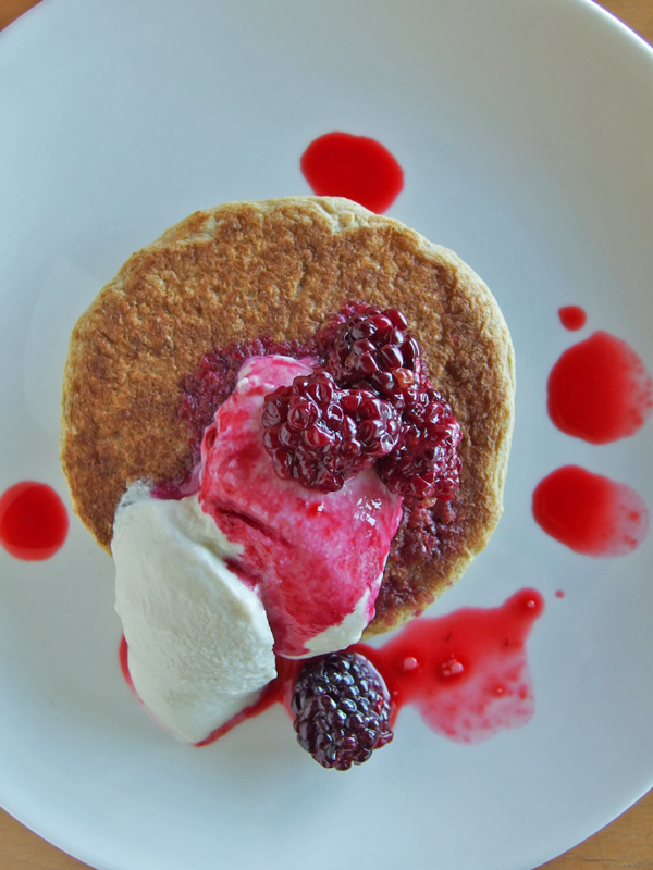 パンケーキに豆乳ナッツクリームを添えて、このブラックベリーソースをかけてみました。