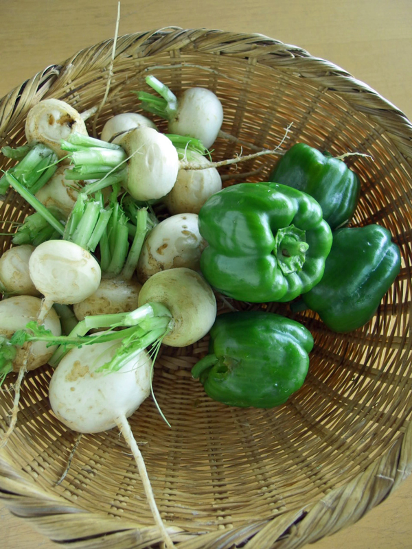 寒い時に育てやすい蕪ですが、Mさんは頑張ってこの時期にトライしました。表皮がザラザラですがお味噌汁やスープに使うと蕪の味が濃くて美味しくいただけます。赤くなる前の緑のパプリカ、実が厚くて普通のピーマンより甘いので、我が家では赤くなるまで待たないで緑のうちに使う事の方が多いのです。