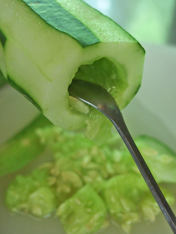 種をとって・・・ 後は昨年ご紹介した一塩胡瓜と同じように作ります。大きな胡瓜は味が瓜に近くなるので、いただく時はギュッと絞ってお醤油を一たらしかけると美味しいです。