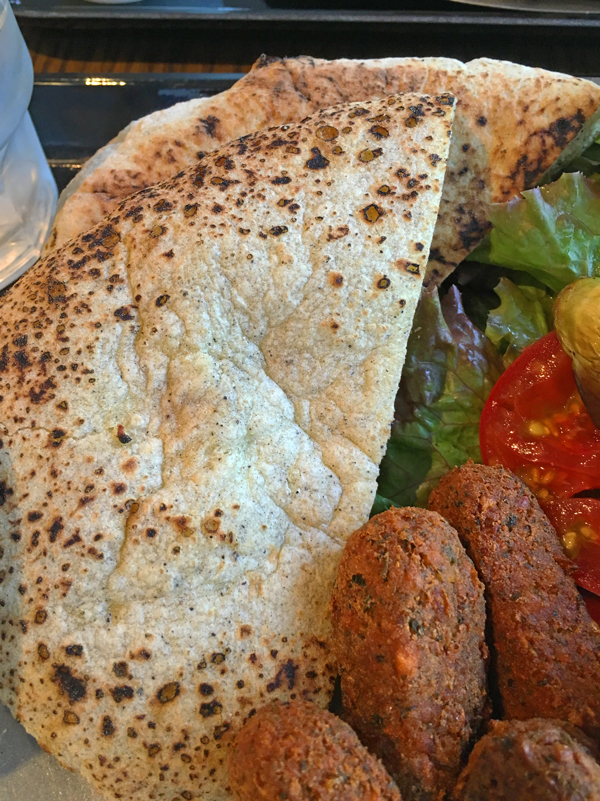 焼きたての全粒粉のピタパンは中がまだしっとりしています。このお店の石釜は薪を使っているのだそうです。エジプトでは全粒粉のピタパンを”エーシュ・バラディー” 田舎風パン、白い粉で焼いたピタパンを”エーシュ・シャーミー”シリア風パン、と呼んでいたのを突然思い出しました。
