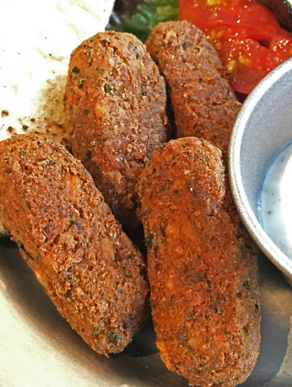 細長くてカリッと揚がったファラフェル。癖のない上品な味です。ファラフェルに添える定番のソース、タヒーナソース(白胡麻のソース)がここではヨーグルトベースのソースでした。